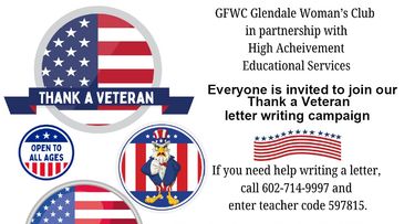 How can you help? Our 2025 goal is to deliver 2,025 thank you letters to our Veterans. Tell your friends and family, Ask everyone to Write thank you letters, every day! Turn in your completed letters to a club member OR drop off at the club's bulk mailbox (7032 N. 56 Ave) OR snap a picture and text to 623-931-7032 OR email your thank you letters to gwcreads@gmail.com